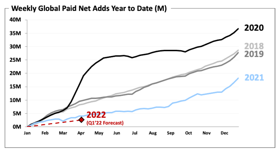 And here is why the stock tumbled, management forecasted Q1’22 paid net additions of 2.5M vs 4.0M a year ago. Acquisition growth has not re-accelerated to pre-COVID levels possibly due to the continuing COVID overhang and macro-economic hardship in several parts of the world like LATAM.
