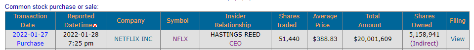 Reed currently owns about 1.11% of Netflix valued at about $2B. He definitely has skin in the game and he actually bought the dip ($19M worth) when the company missed estimates in the most recent quarter. This was the first time he actually purchased Netflix stock from the open market.