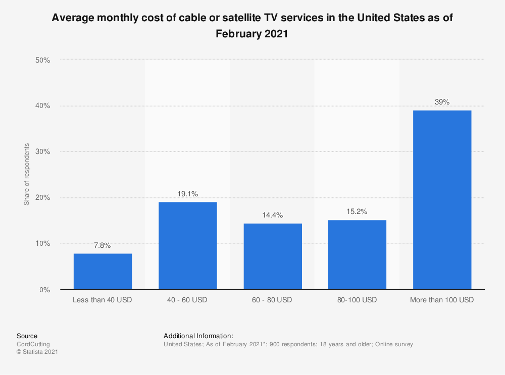 According to Statista, most Pay TV users pay north of 100USD a month, which can easily be replaced with a bundle of three to five streaming services per household. Cord cutting will continue to accelerate and there will be room for a few streaming services to take up this space.