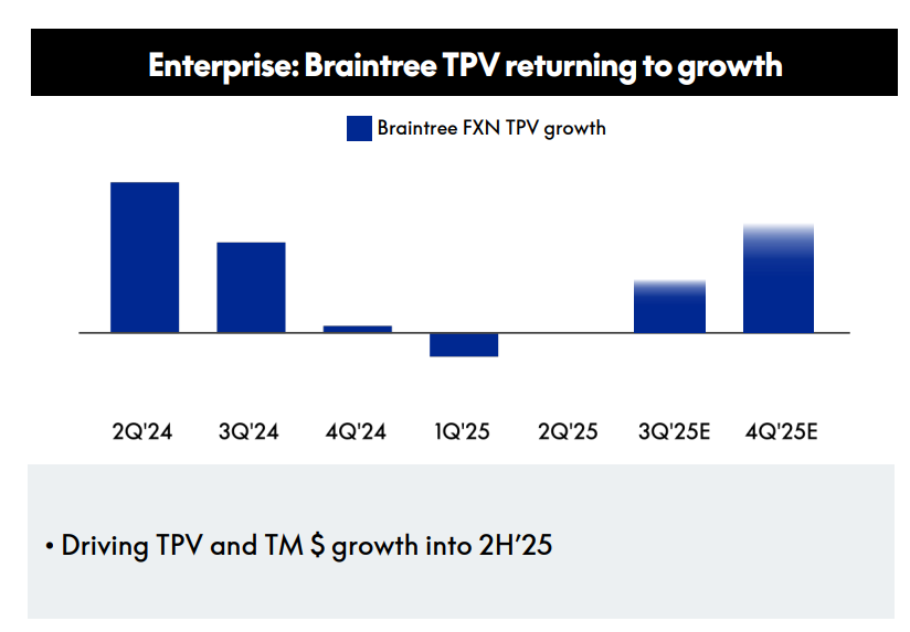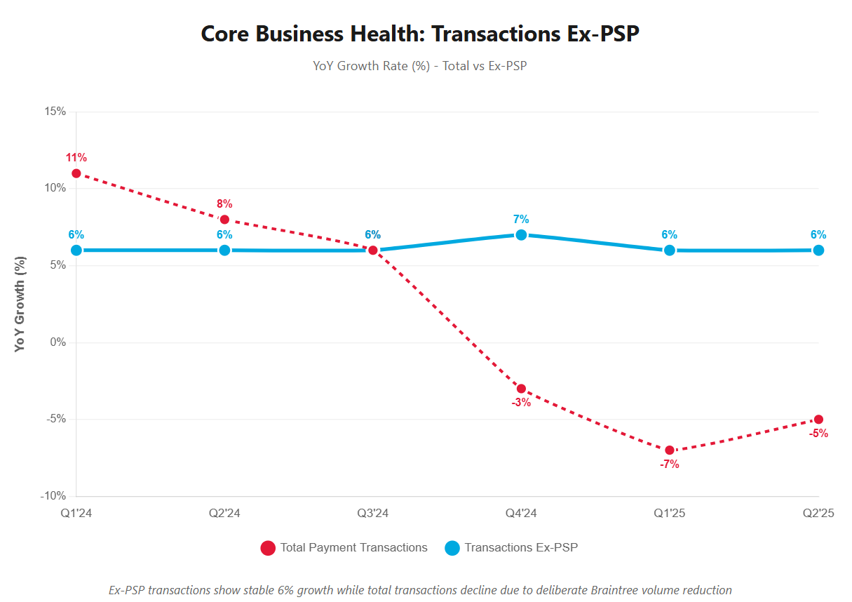 This statement encapsulates Braintree’s journey. After deliberately shedding unprofitable volume and accepting growth headwinds, the business appears to be stabilizing—roughly flat in Q2 with growth expected in Q3. This is happening six months ahead of management’s original timeline, suggesting the strategic reset is gaining traction.