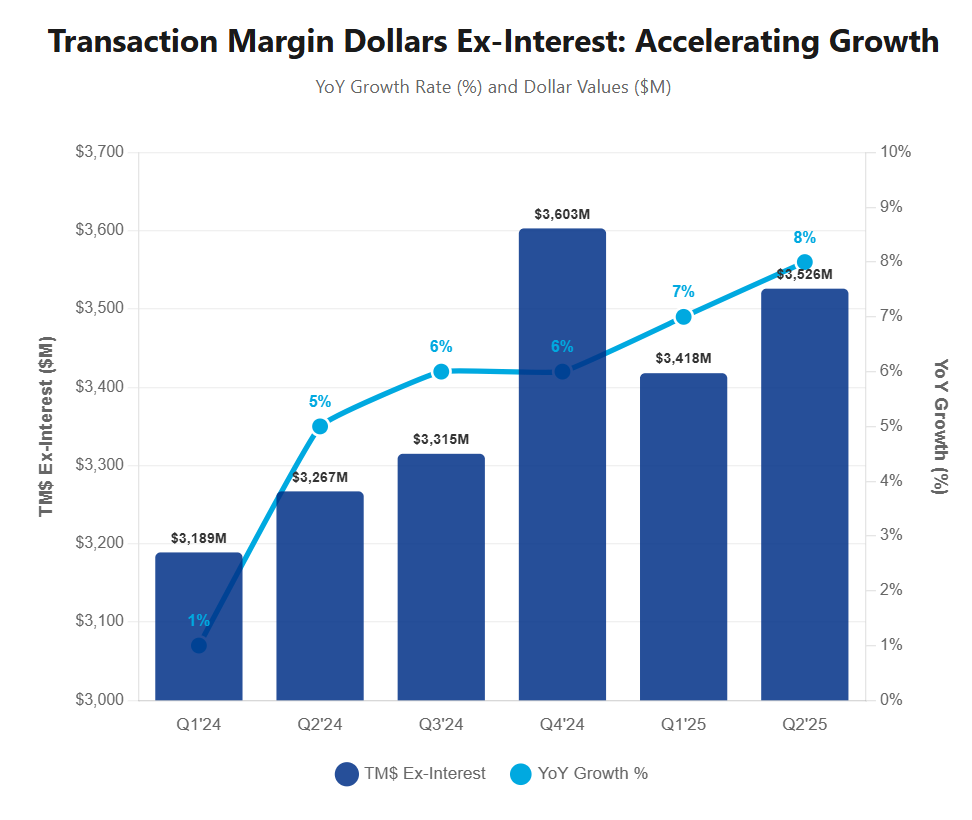Transaction margin dollars (TM$) excluding interest on customer balances grew 8% to $3.5 billion, accelerating from Q1’s 7% growth. This metric strips out interest earned on customer cash balances, revealing the core earnings power of PayPal’s transaction business.