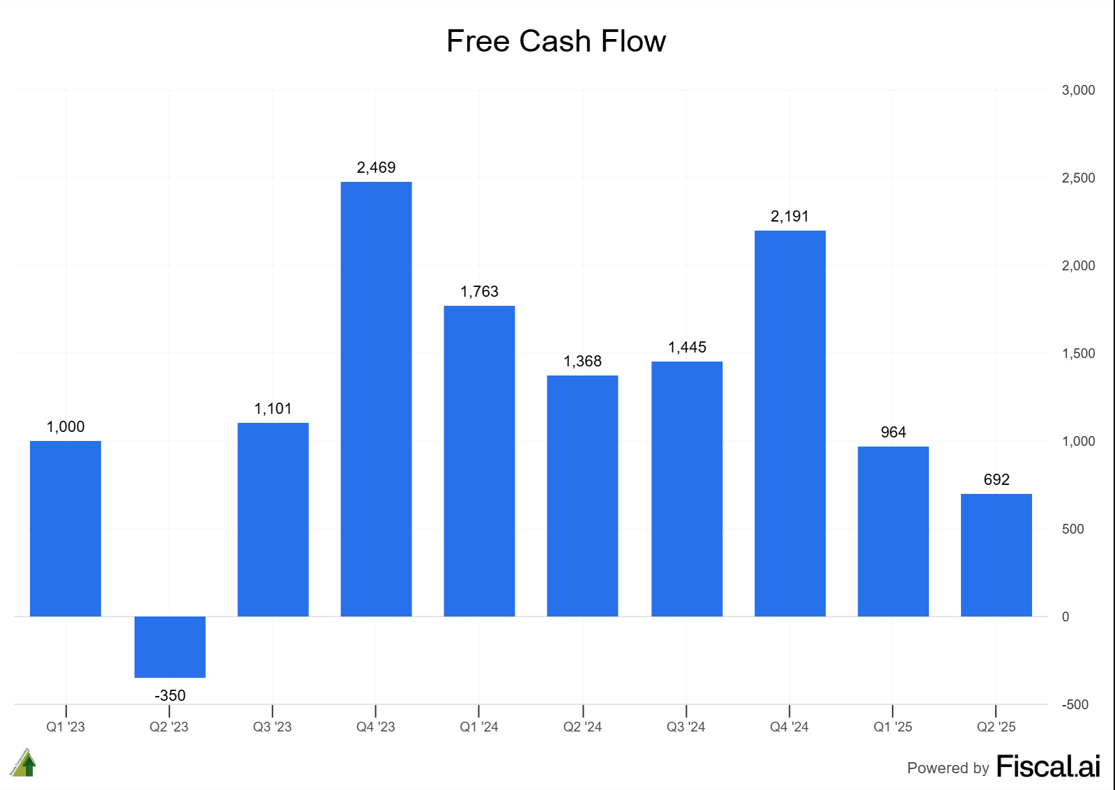 Free Cash Flow Timing: Q2 free cash flow of $692 million (-49% YoY) looks concerning at first glance. However, CFO Miller specifically explained: “Adjusted free cash flow was negatively impacted by timing shifts in working capital, which we expect to reverse in the second half of the year.” The company reaffirmed full-year guidance of $6-7 billion, implying over $5 billion in H2. We’ll continue to monitor if the cash shows up in Q3 and Q4.