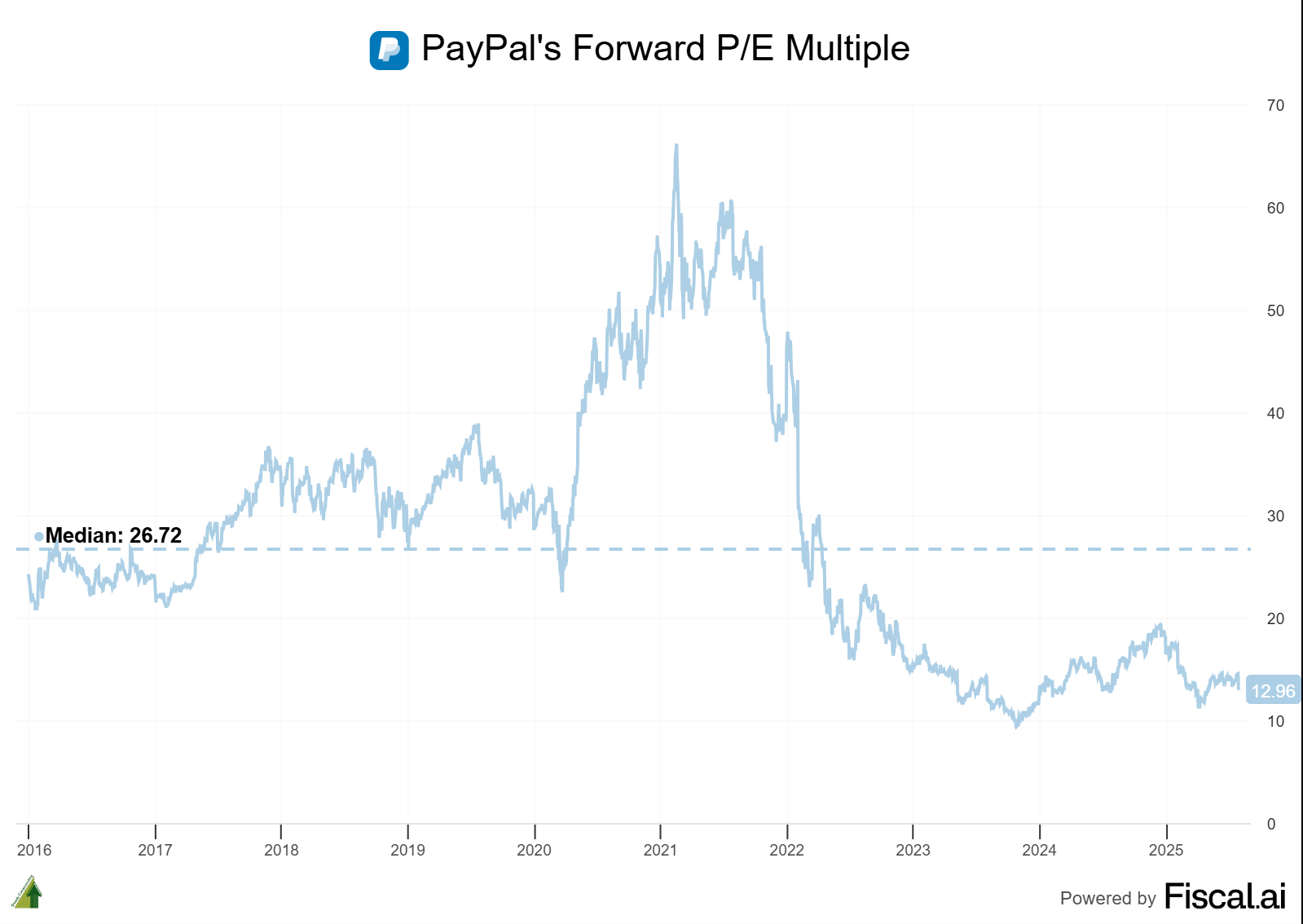 PayPal continues to trade at a very undemanding ~13x forward P/E despite improving fundamentals across multiple business lines. This valuation stands in stark contrast to its historical average of 26x—a multiple the company commanded when it was viewed as a high-growth fintech leader rather than a mature payments processor.