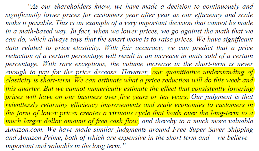 Here is what Jeff Bezos, Amazon founder has to say about price-giveback in their annual report: