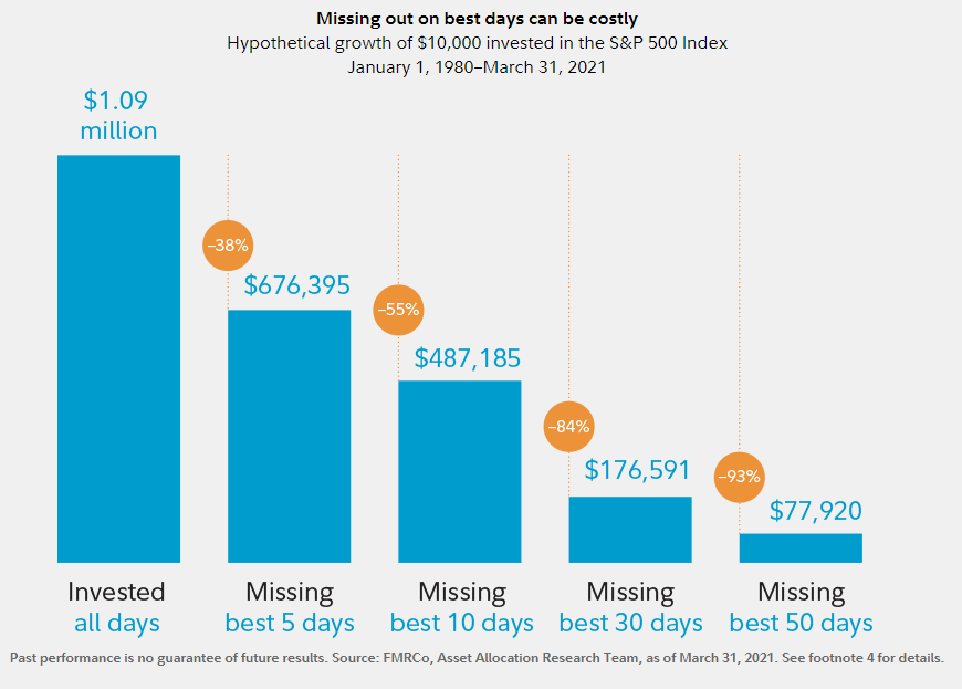 The common advice thrown around is to stay fully invested all the time and ride out the volatility. If you missed just five of the best days, your returns would drop by 38%!