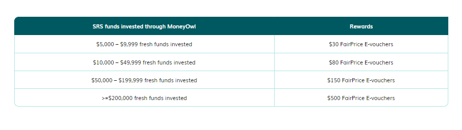 For a limited time, MoneyOwl is giving away FairPrice E-vouchers worth up to $500 for clients who invest their SRS funds on its platform before 31 Dec 2022!